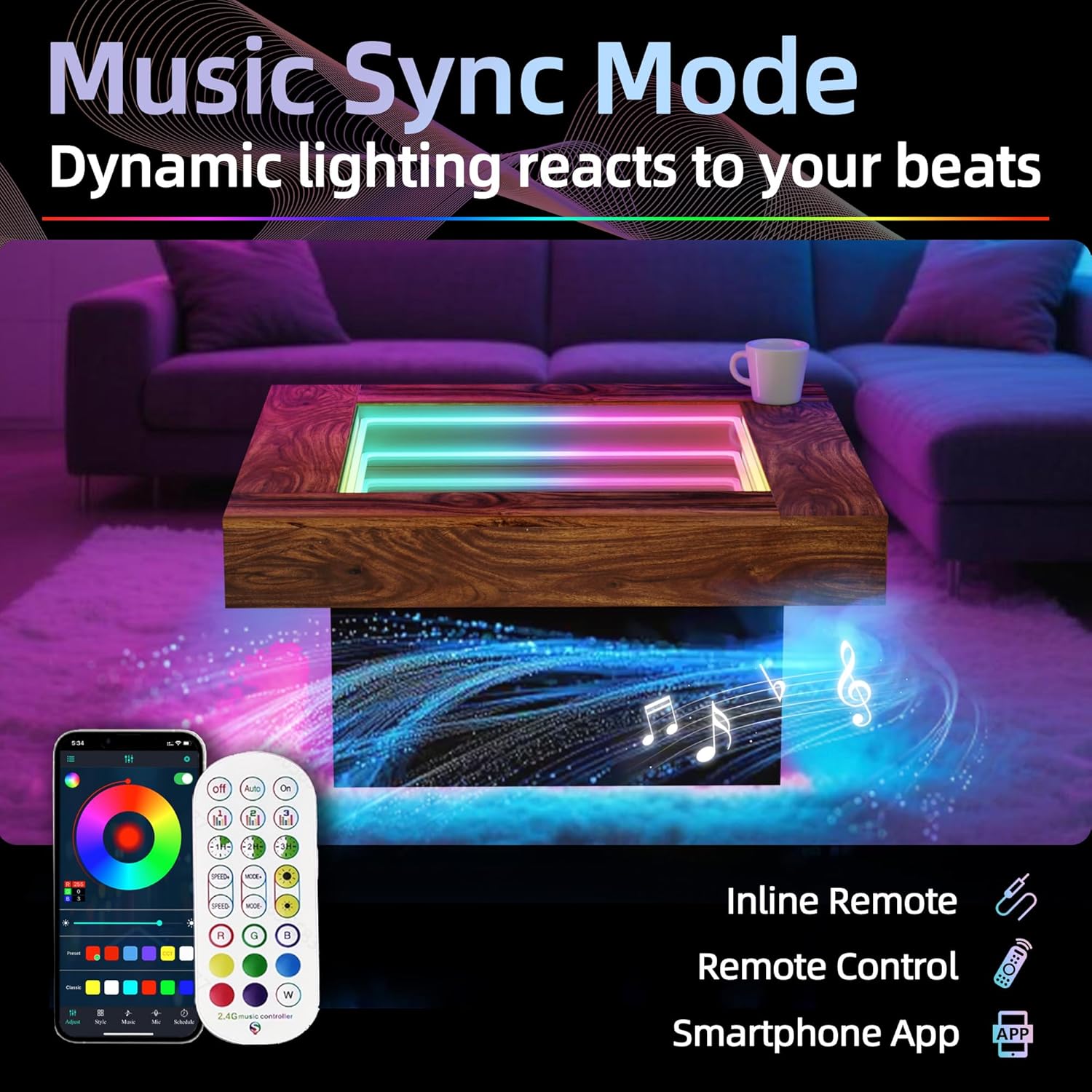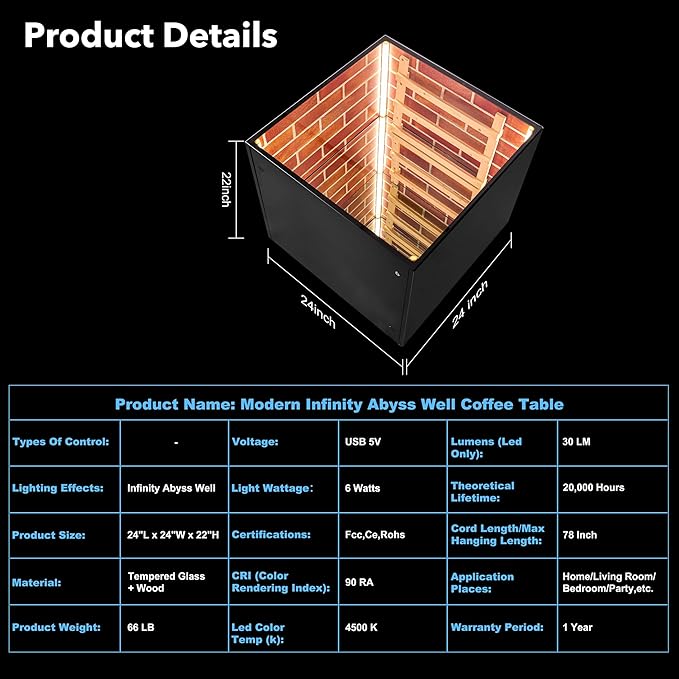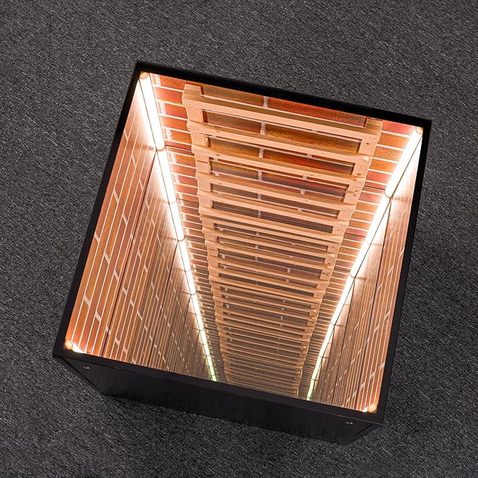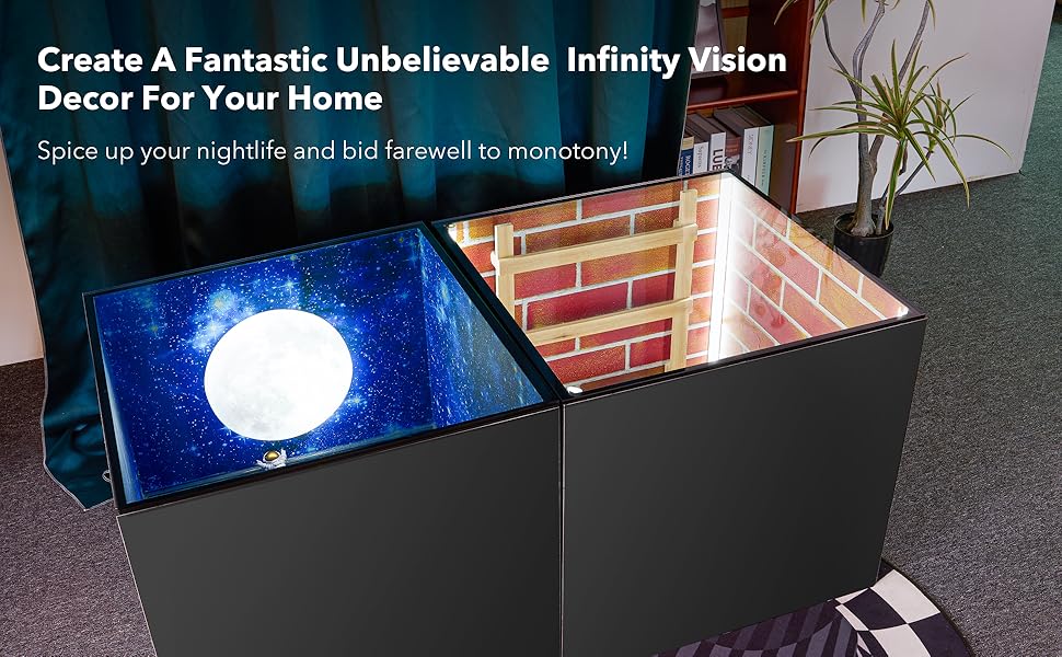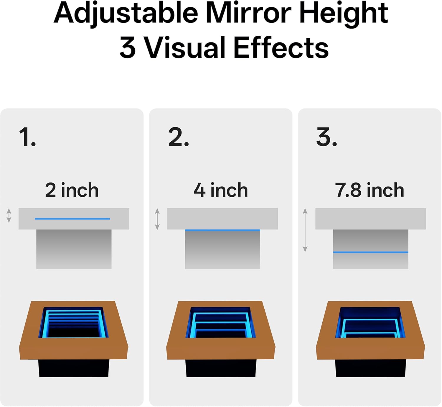 Mesa innovadora con efecto visual de profundidad infinita mediante espejos y luces LED RGB. Transforma cualquier espacio en una experiencia futurista y cautivadora.